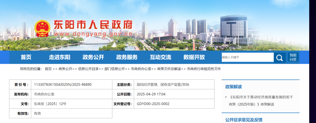 东阳市人民政府印发关于推动经济高质量发展的若干政策(2025年版)的通知